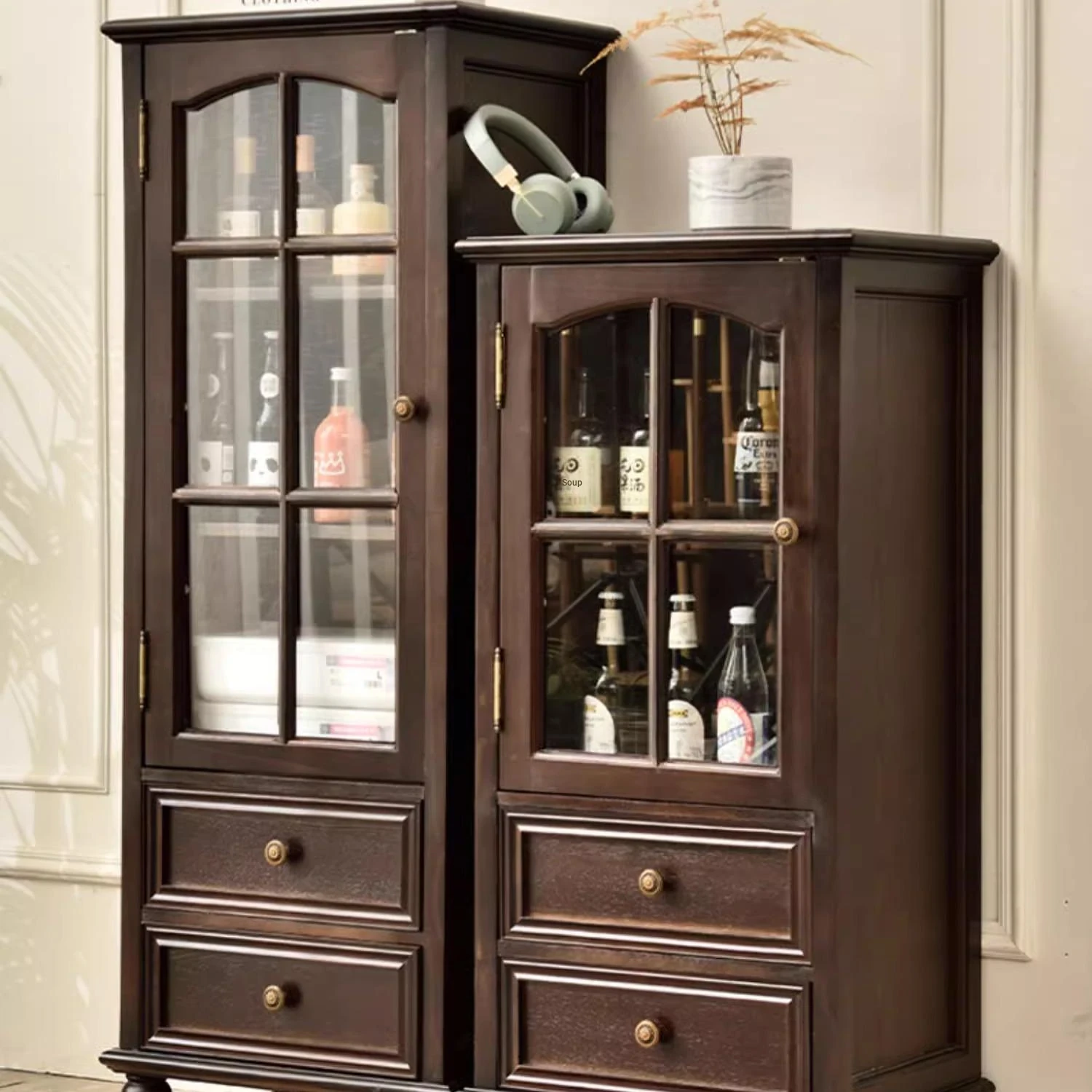 "Baishi Solid Wood Wine Cabinet with Glass Doors – Vintage American Style Sideboard for Small Living Rooms, Perfect for Dining and TV Areas"