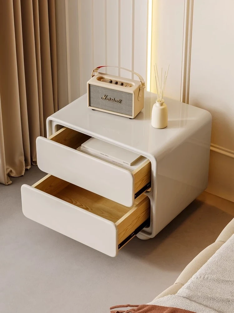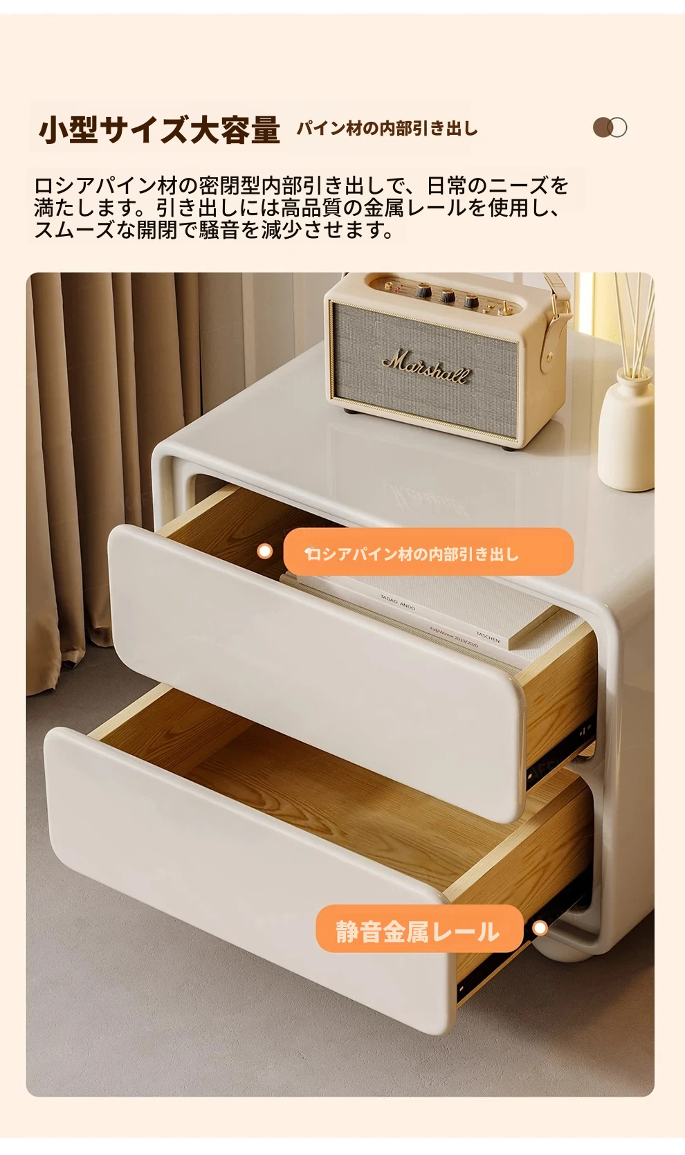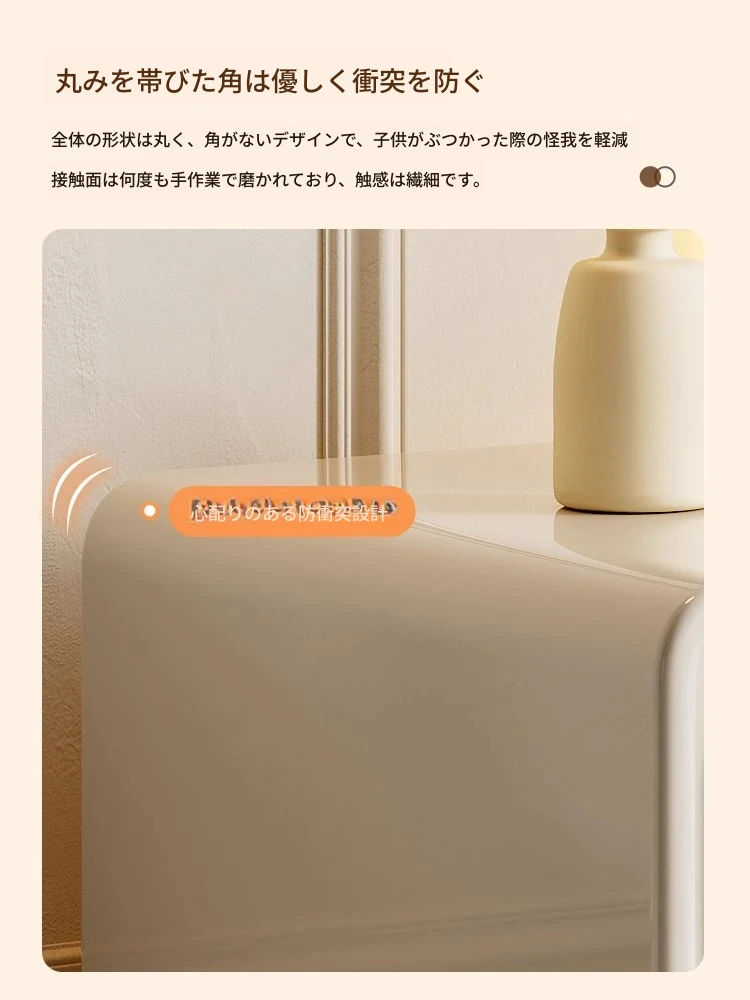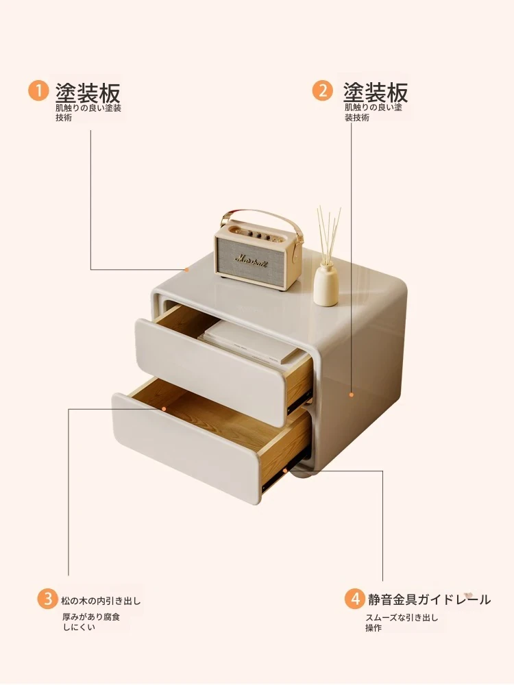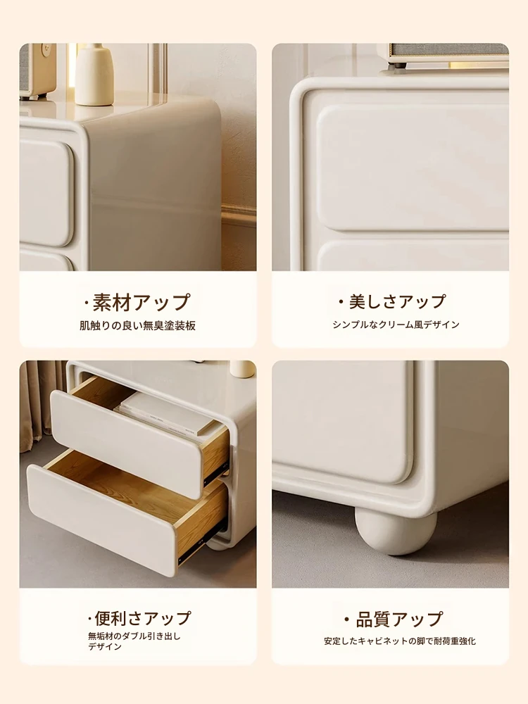 ナイキュウミニマルクリーム風デザインの天然木製ベッドサイドキャビネット - おしゃれで実用的な収納力、あなたの寝室を洗練された空間に演出!