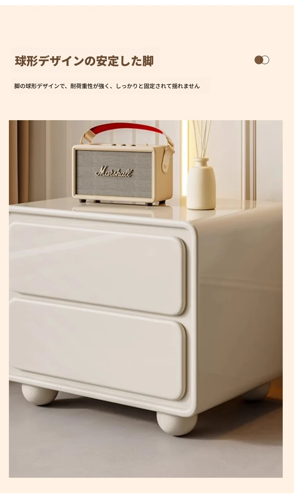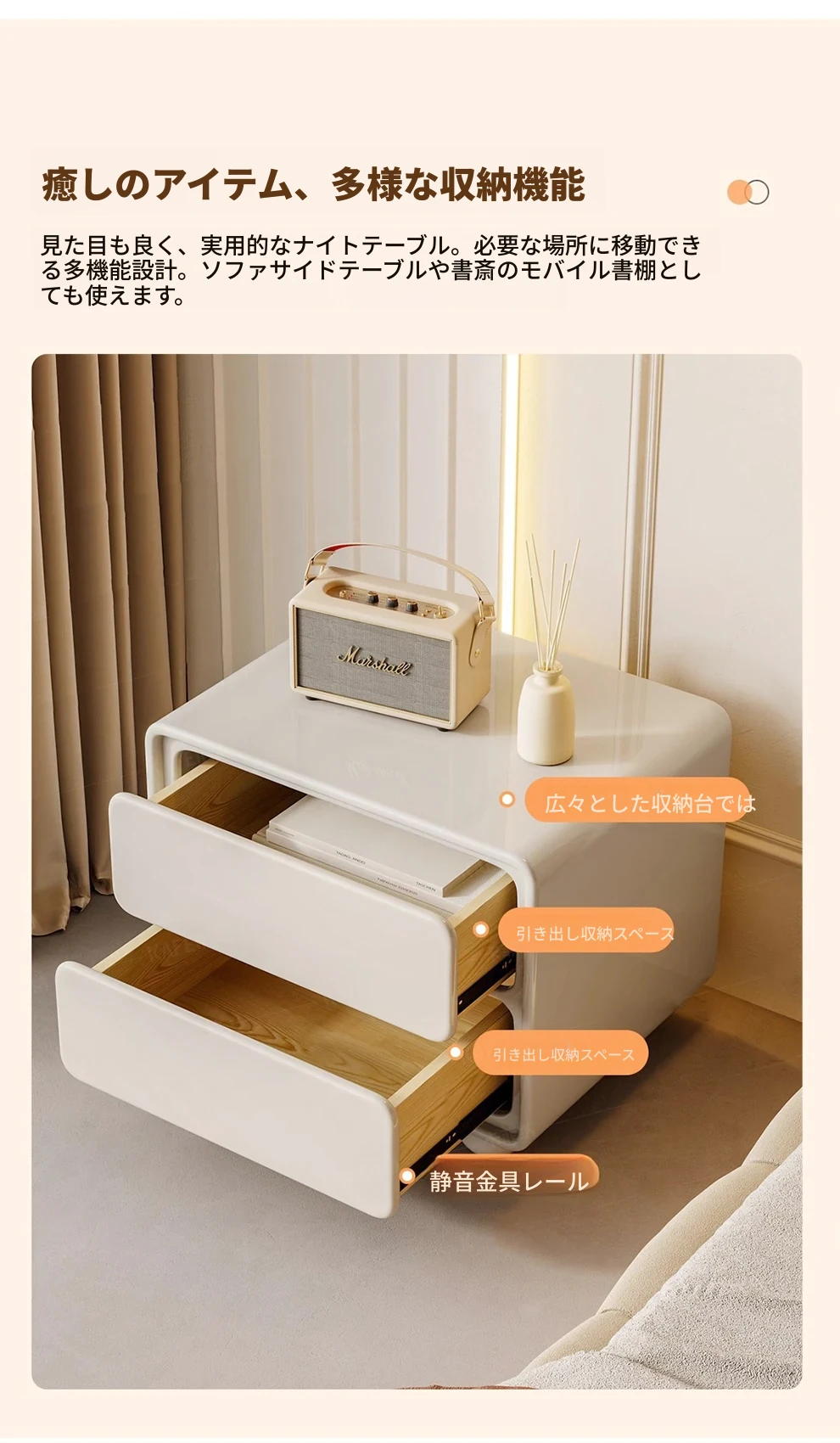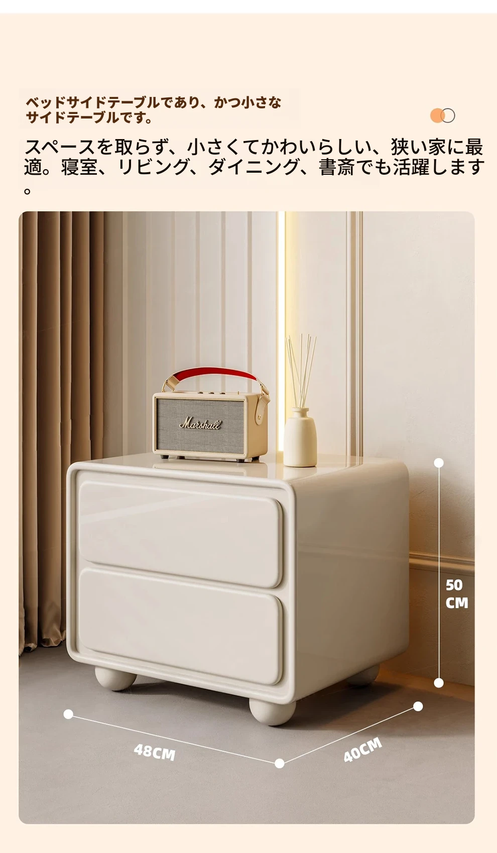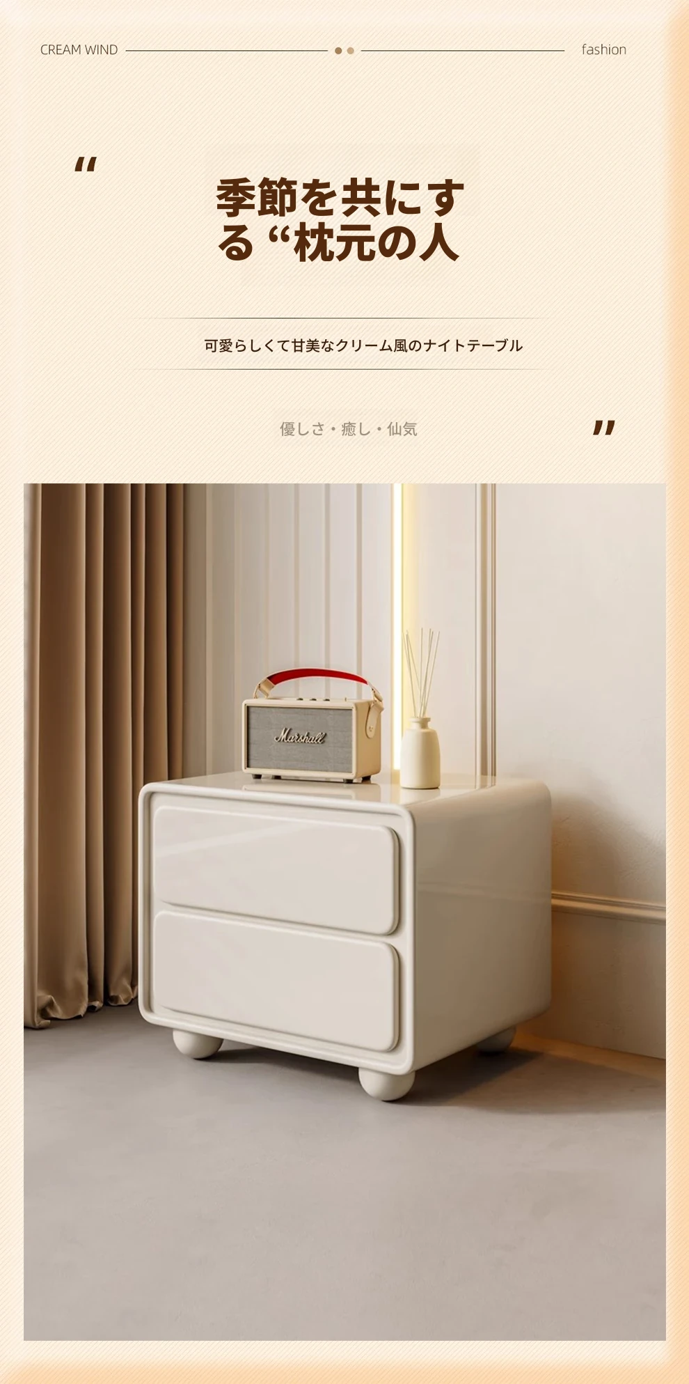ナイキュウミニマルクリーム風デザインの天然木製ベッドサイドキャビネット - おしゃれで実用的な収納力、あなたの寝室を洗練された空間に演出!
